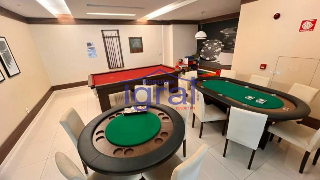 - Lazer: churrasqueira, piscina, piscina aquecida, piscina infantil, playground, quadra poliesportiva, sala de ginástica, salão de festa, salão de jogos e sauna.